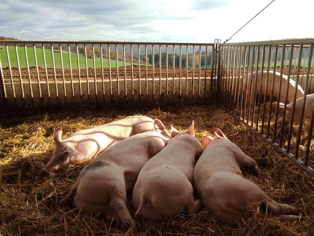Unser neuartig konzipierter Schweinestall steht für das Wohl des Tieres. Die Schweine haben bei uns jede Menge Platz und leben auf Stroh. Eine Besonderheit ist der Auslauf. Alle Tiere haben zu jeder Zeit die Möglichkeit den Innenraum zu verlassen, um die frische Luft im Außenbereich zu genießen oder sich von der Sonne verwöhnen zu lassen. Unsere Schweine kommen aus der näheren Umgebung zu uns.